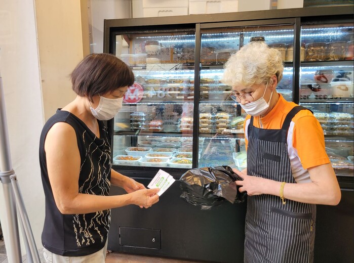 ▲중앙동 지역사회보장협의체로부터 'J드림쿠폰'을 지원받은 대상자가 반찬가게에서 쿠폰으로 반찬을 교환하고 있다. |