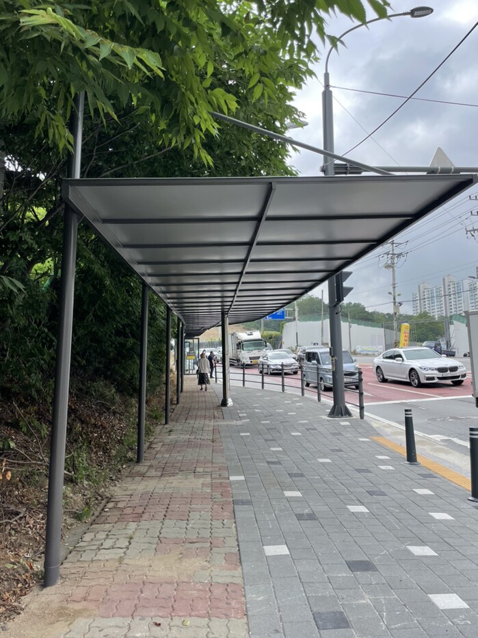 버스승강장인 이곳은 평소 버스를 타려는 주민들이 대기 줄이 길게 늘어서 있고 경사가 있어 우천 시 낙상 사고나 미끄러짐 등 안전 사고 발생 위험이 높았다.