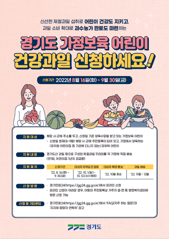 [로컬세계 = 이영원 기자]경기 파주시(시장 김경일)는 9월 30일까지 가정 보육 어린이들에게 제철 과일을 제공하는 ‘2022년 경기도 어린이 건강과일 지원사업’ 신청 접수를 받는다고 밝혔다.