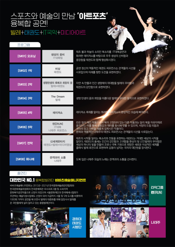 ‘LED 비바츠 태권발레’는 서양의 예술과 한국 스포츠를 접목한 대표적인 아트포츠(artport) 댄스뮤지컬 작품으로 자리잡으며 가족 관객층을 끌어들였으며 발레와 태권도를 기반으로 정보기술(IT) 미디어와 애니메이션을 결합시켜 관객의 시선을 집중시킬 예정이다.