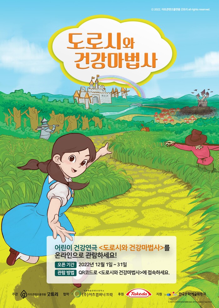 한국다케다제약이 후원하고 아트콘텐츠플랫폼 굿트리가 주관하는 어린이 건강연극 ‘도로시와 건강마법사’는 동화 ‘오즈의 마법사’를 모티브로 하여 어린이들이 반드시 인지하고 있어야 하는 건강 정보를 눈높이에 맞춰 연극으로 제작했다.