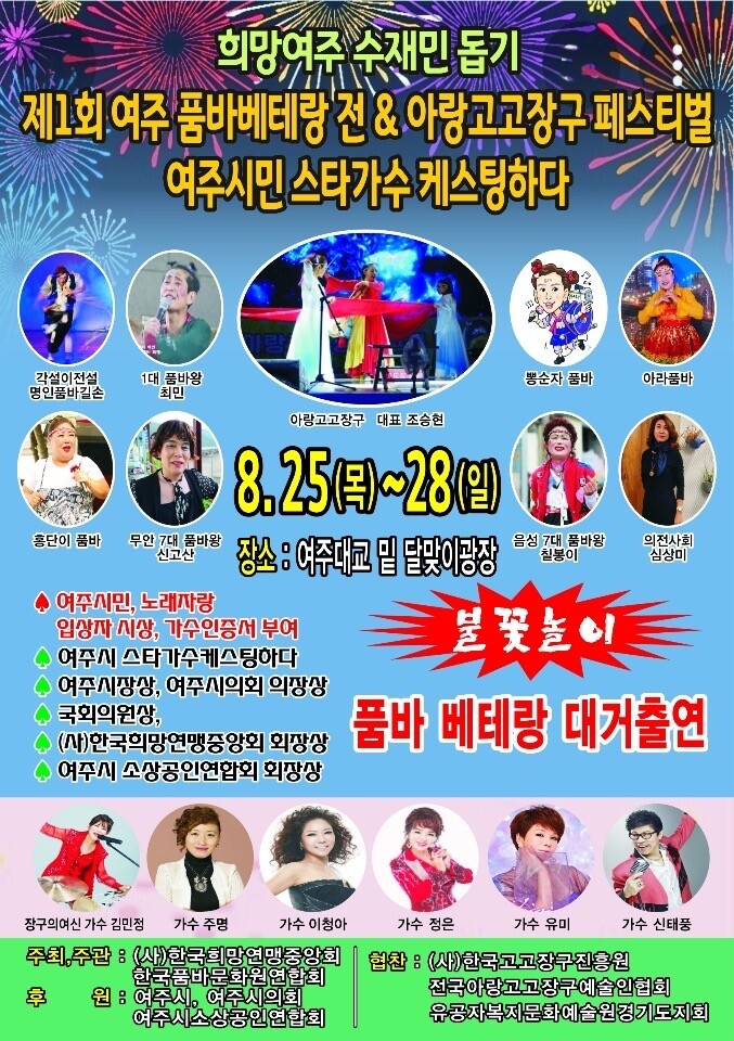[로컬세계=김병민 기자] (사)한국희망연맹중앙회와 (사)한국품바문화원연합회에서 주관하는 ‘희망여주 수재민 돕기 제1회 여주품바!베테랑전&아랑고고장구 페스티벌’이 8. 25.(목) ~ 8. 28.(일) 여주 도서관 앞 달맞이광장에서 4일간 개최되며, 8. 26.(금) 17:30에 개막식이 진행될 예정이다.