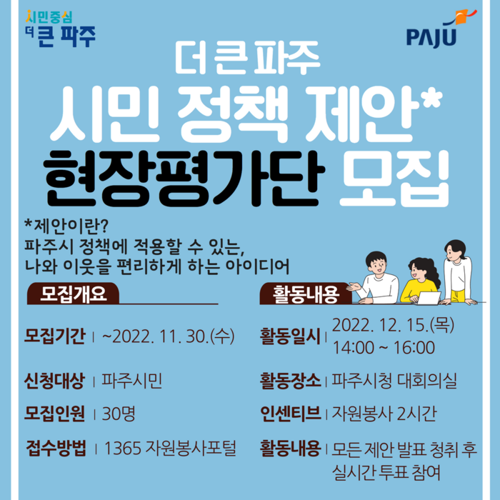 [로컬세계 = 이영원 기자]경기 파주시는 ‘더 큰 파주 시민 정책 제안 공모전’의 본심사가 오는 12월 15일에 개최됨에 따라 자원봉사자 형태의 현장 평가단 30명을 모집한다고 18일 밝혔다.