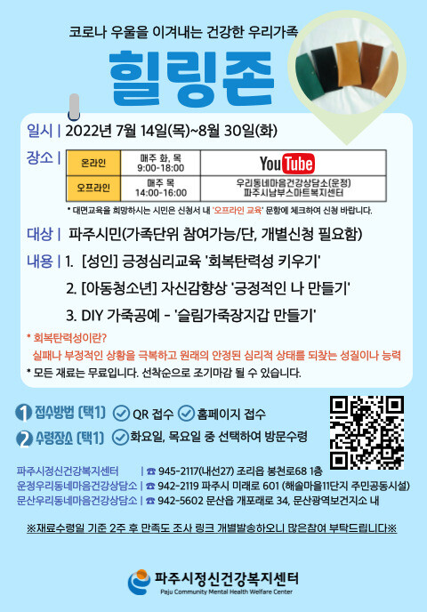 코로나19 상황 악화 시 프로그램은 비대면으로 전환될 수 있으며 자세한 사항은 파주시정신건강복지센터로 문의하면 된다.
