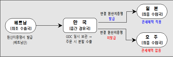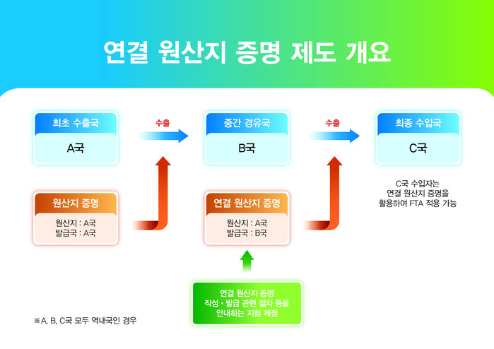 동일한 자유무역협정(FTA)을 체결한 역내국으로 재수출하는 물품은 중간 경유국에서 최초 수출국의 원산지증명에 기초해 연결 원산지증명을 작성·발급할 수 있다.