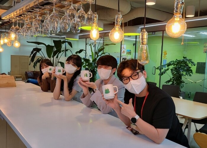 ▲㈜하이로닉 직원들이 조아용이 그려진 머그컵을 들고 환하게 웃고 있다. 용인시 제공 |