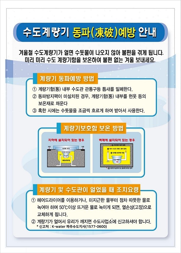 계량기 동파가 발생한 경우 한국수자원공사 파주수도지사로 연락하면 응급복구 서비스를 받을 수 있다.