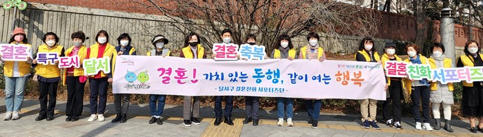 [로컬세계 박세환 기자]대구 달서구는 지난 25일 긍정적 결혼문화 확산을 위해 이곡역네거리에서 결혼친화 서포터즈단과 함께 결혼장려 홍보 캠페인을 전개했다고 29일 밝혔다.