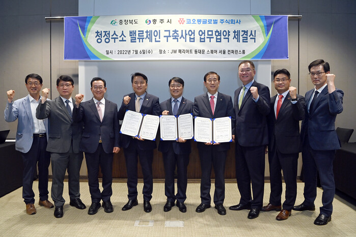 코오롱글로벌은 6일 충청북도, 충주시와 함께 동대문 JW메리어트호텔에서 ‘청정수소 밸류체인 구축사업 협력을 위한 업무협약’을 체결했다고 밝혔다. 이날 협약식에는 김정일 코오롱글로벌 대표이사 사장, 김영환 충북도지사, 조길형 충주시장, 이종배 국회의원 등이 참석했다.