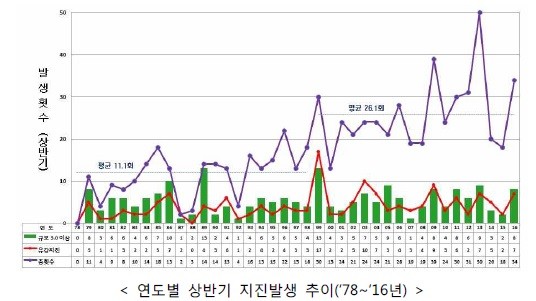 규모 3.0 이상 국내 지진 발생횟수는 8회로 예년 상반기 평균 5.7회보다 많았고 유감지진 발생횟수도 7회로 예년 상반기 평균 5.4회 보다 많았다.