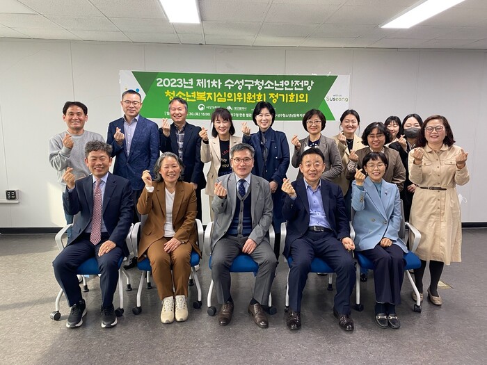 | ▲ 대구 수성구청소년상담복지센터는 만촌 별관 8층 회의실에서 2023년 제1차 수성구 청소년안전망(CYS-Net) ‘청소년복지심의위원회’ 정기회의를 개최 후 기념 촬영하고 있다. 수성구 제공 |