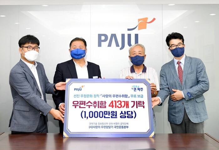 김경일 파주시장은 “이번 기탁을 통해 쾌적한 우편 환경이 구현되고, 고품질 우정서비스 제공에 도움이 됐으면 좋겠다”며 “우편물이 신속·정확하고 안전하게 전달될 수 있도록 관내 경로당에 우편수취함을 무료로 보급해 주셔서 감사드린다”고 말했다.