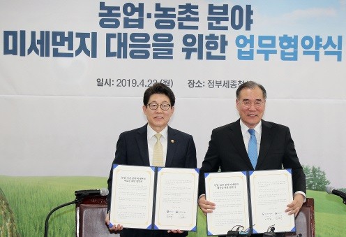 환경부와 농림축산식품부는 지난 22일 정부 세종청사에서 농업·농촌분야 미세먼지 대응을 위한 업무협약을 체결했다고 밝혔다.