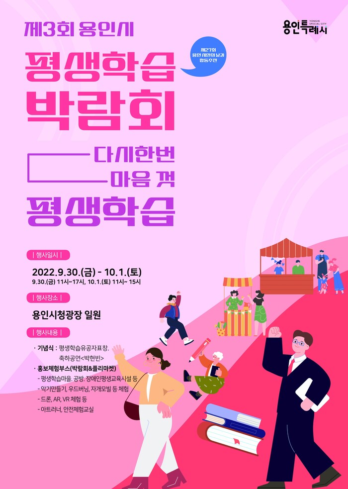 용인특례시는 평생학습문화 확산을 위해 지난 2019년부터 개최하고 있다. ‘다시 한번 평생학습, 마음껏 평생학습’을 주제로 준비한 올해 박람회는 축하공연을 비롯해 체험, 플리마켓, 전시 등 즐길거리가 다채롭다.