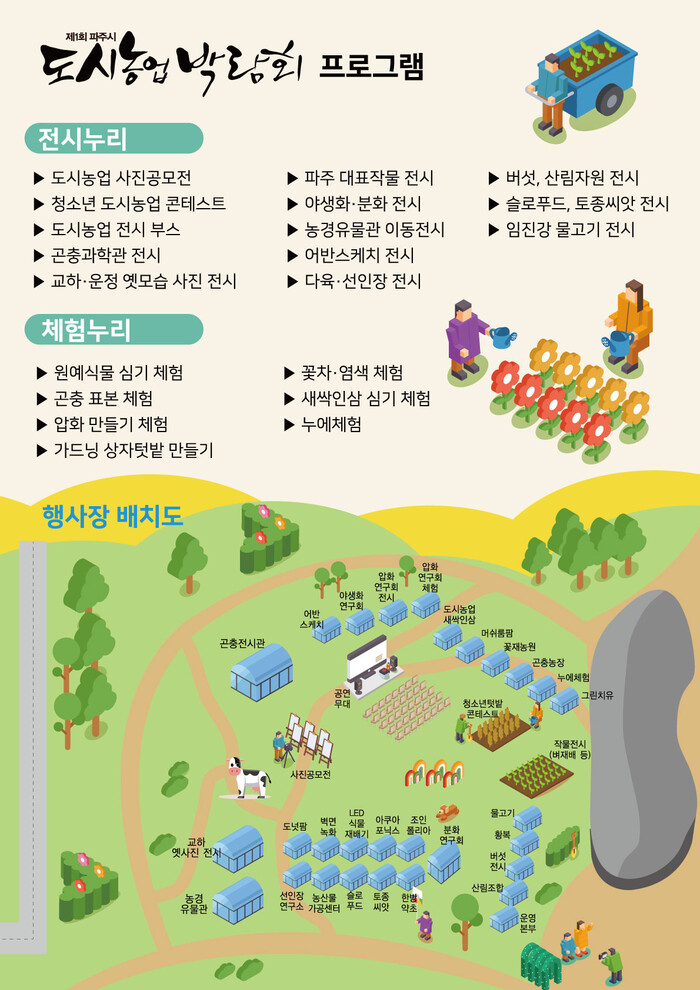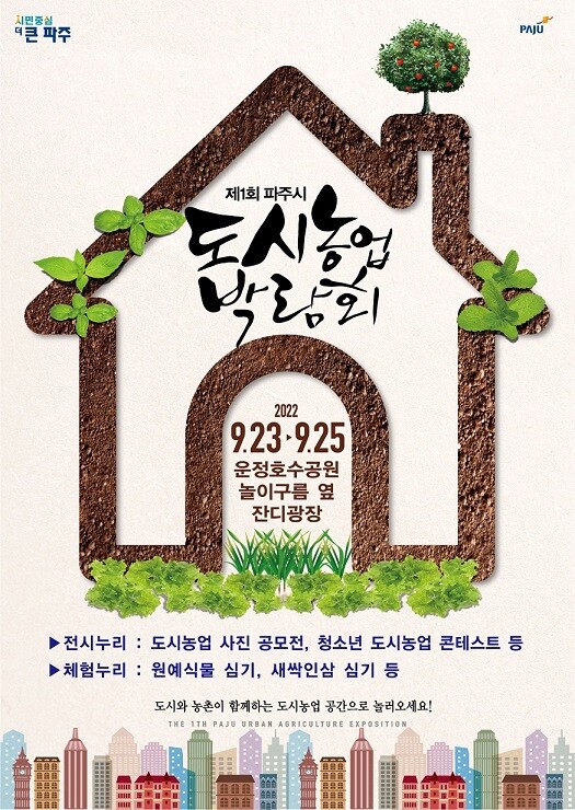 [로컬세계 = 이영원 기자]경기 파주시는 오는 23부터 25일까지 운정호수공원 놀이구름 옆 잔디광장(파주시 와석순환로 470)에서 ‘도시농부의 꿈’이라는 주제로 제1회 파주시 도시농업박람회를 개최한다.
