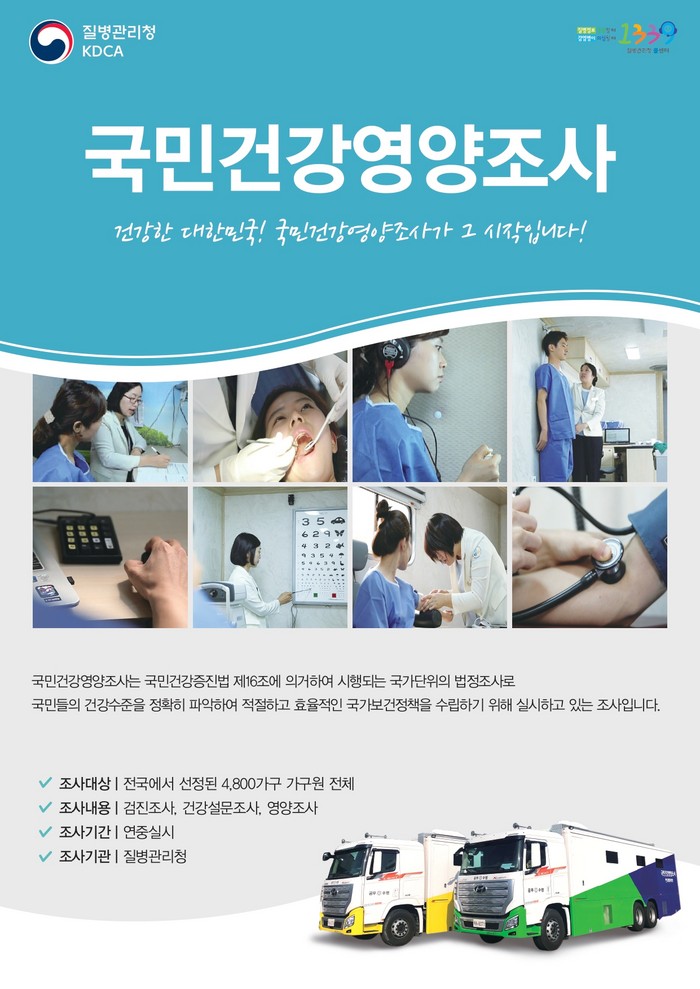 조사는 국민의 건강수준, 건강행태, 영양섭취 실태에 대한 대표성과 신뢰성을 갖춘 통계를 산출해 보건정책의 기초자료로 활용하는 전국 규모의 조사이다.
