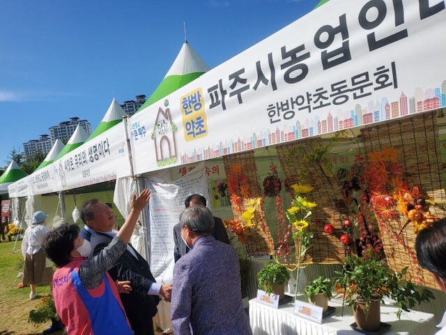 이날 부스에는 농업인대학 허준약초동문회 50여 명이 참가해 파주시에서 재배되는 약용작물 종류와 약용작물 재배 시 선택 요령을 안내했다.