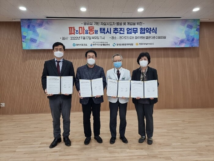 이번 협약을 통해 파주시보건소, 파주시자살예방센터, 경기도의료원 파주병원, 거성운수일 주식회사 4개 기관은 인적·물적 자원 협력을 통해 지역사회 맞춤형 자살고위험군을 발굴하기로 했다.