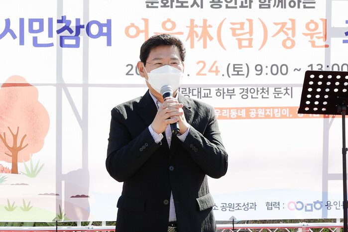 ▲ 이상일 용인특례시장이 24일 처인구 마평동 경안천 시민참여 어울림정원 조성 행사에 참석해 인사말을 하고 있다. 용인시 제공 |