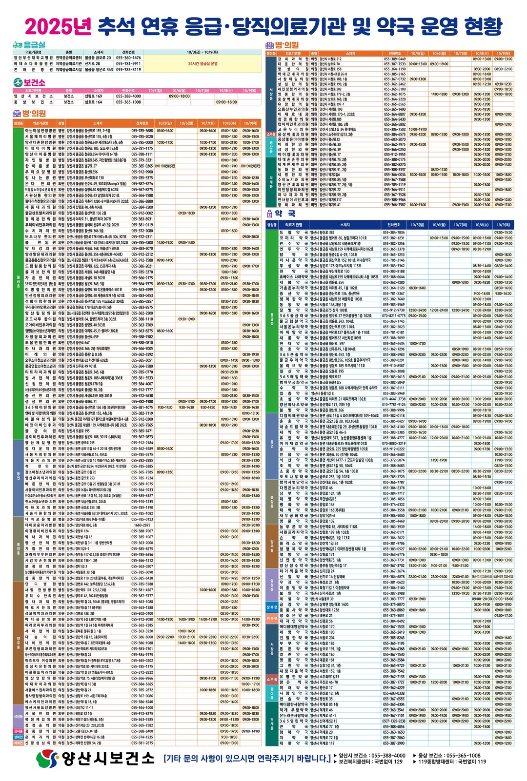 연휴 동안 진료 가능한 의료기관과 약국 정보는 응급의료포털(e-gen), 양산시청·보건소 홈페이지 또는 응급똑똑 앱에서 확인할 수 있다.