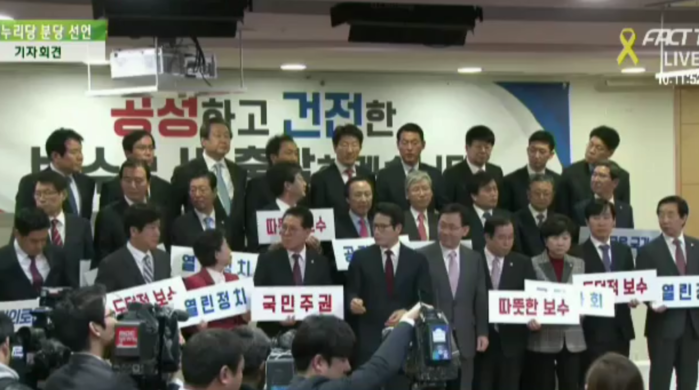 ▲분당을 선언한 새누리당 비박계 29명의 의원들이 기자회견을 열고 있다. 사진은 팩트TV 화면 캡쳐. |