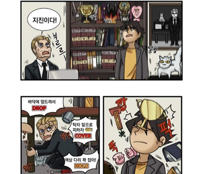 ▲지진 대피요령 웹툰 공모전에서 최우수상으로 선정된 ‘지진 대피엔 GOGOGO DCH’ 웹툰.(행안부 제공) |
