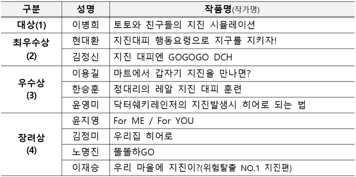 이밖에도 우수상과 장려상으로 선정된 작품도 지진 대피요령을 재미있게 표현해 활용도가 높은 작품이 다수 출품됐다.