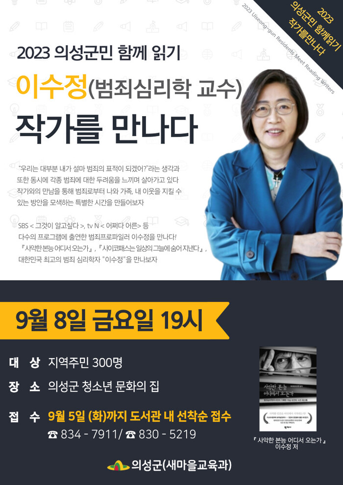 [로컬세계=박상진 기자]경북 의성군은 오는 9월 8일 오후 7시에 의성군청소년문화의집에서 범죄심리학자 이수정 교수의 저자강연회를 개최한다고 29일 밝혔다.