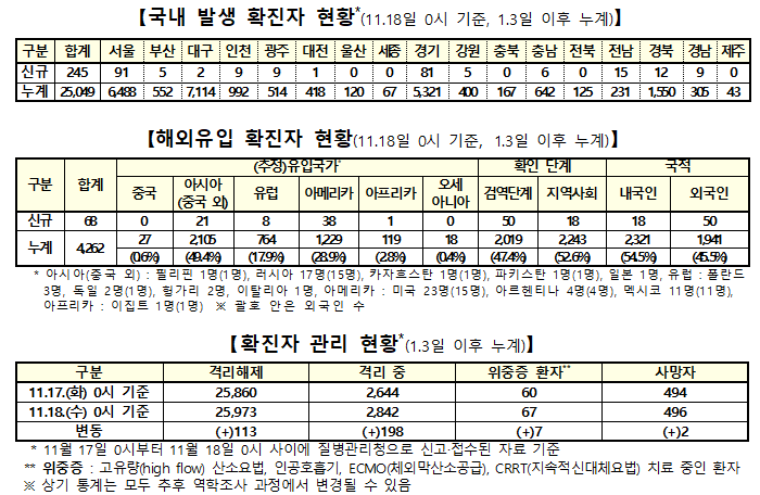 질병관리청 중앙방역대책본부(본부장:정은경 청장)는 18일 0시 현재, 국내발생 신규 확진자는 245명이 확인됐고, 해외유입은 68명이 확인돼 총 누적 확진자수는 2만9311명(해외유입 4262명)이라고 밝혔다.