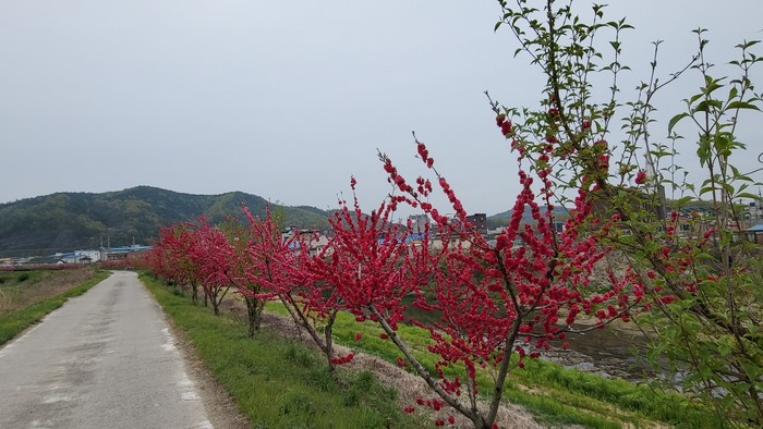 올해의 복숭아꽃은 예년에 비해 더욱더 만개해 봉양면 전체를 화사한 빛깔과 은은한 향기로 아름답게 물들이며 그 자태를 자랑하고 있다.