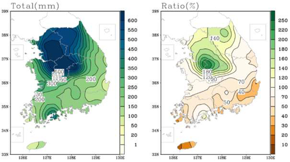 중부지방을 중심으로 장마전선이 활성화되어 강수량이 평년보다 많았으며, 제주도와 남부지방은 북태평양고기압 영향권에 들어 강수량이 적었다. 평년(1981~2010년) 남부와 중부지방의 평균 강수량 차이는 17.8㎜이나, 올해 남북 장마 강수량의 차이가 254.9㎜로 매우 컸으며 특히 제주도는 평년 강수량의 23% 수준, 남부지방은 53% 수준으로 매우 적은 강수량을 기록했다.