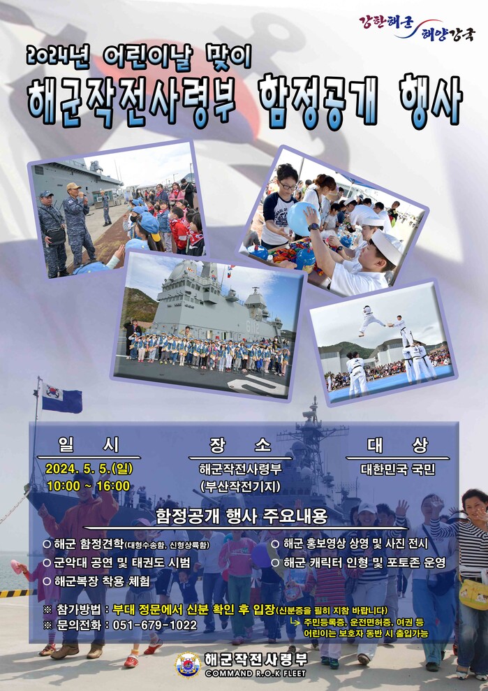 [로컬세계 부산=맹화찬 기자]해군작전사령부(이하 ‘해작사’)는 어린이날을 맞이하여 5월 5일(일) 하루 동안 부산작전기지에서 함정공개 행사를 개최한다.