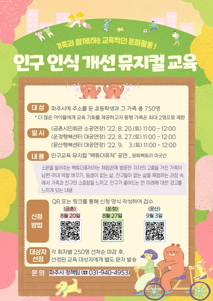 이에 따라 파주시는 ‘백투더퓨처’ 뮤지컬 작품을 통해 인구문제의 중요성과 가족의 소중함을 전달할 예정이며, 이와 관련된 뮤지컬 교육은 파주시에 거주하는 초등학생과 그 가족을 대상으로 총 3회 진행된다.