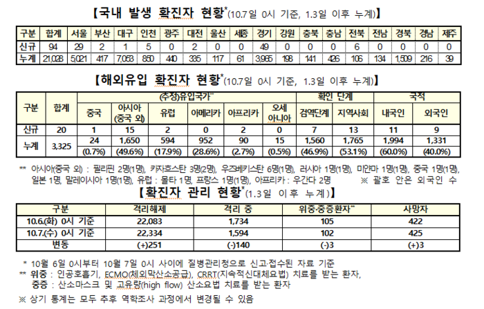 질병관리청 중앙방역대책본부(본부장:정은경 청장)는 7일 0시 현재, 국내발생 신규 확진자는 94명이 확인됐고, 해외유입은 20명이 확인돼 총 누적 확진자수는 2만4353명(해외유입 3325명)이라고 밝혔다.