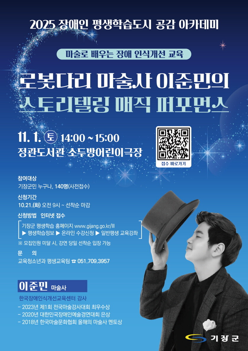정종복 기장군수는 “이번 마술공연을 통해 장애와 비장애의 경계를 넘어 서로 공감하고 이해하는 뜻깊은 시간이 되길 바란다”라며 “감동과 용기를 전하는 이번 공연에 군민들의 많은 참여를 바란다”고 말했다.
