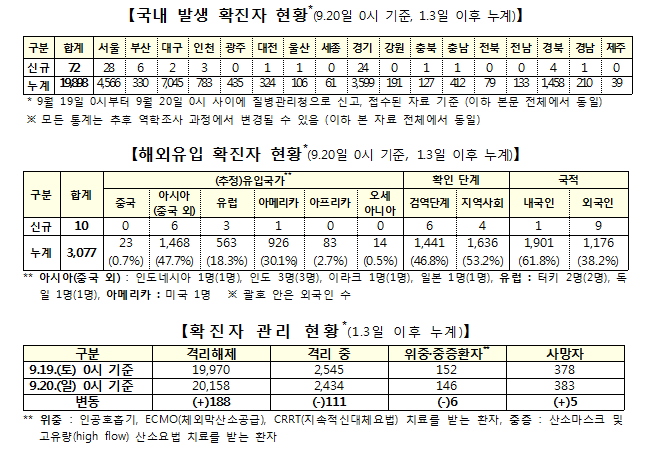 질병관리본부 중앙방역대책본부(본부장 정은경)는 20일 0시 현재, 국내발생 신규확진자는 72명이 확인됐고, 해외유입은 10명이 확인돼 총 누적 확진자수는 2만2975명(해외유입 3077명)이라고 밝혔다.