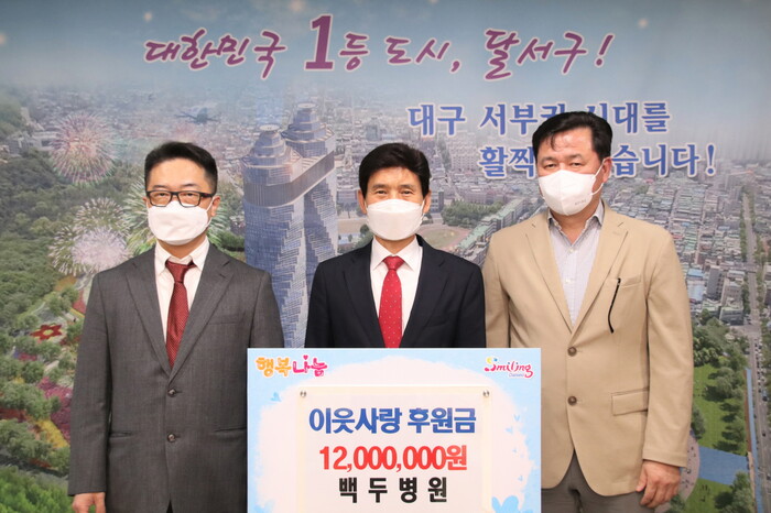 [로컬세계=박세환 기자] 대구 달서구(구청장 이태훈)는 지난 7일 백두병원(원장 배상근)으로부터 후원금 1,200만원을기탁 받았다고 8일 밝혔다.
