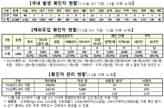 질병관리청 중앙방역대책본부(본부장:정은경 청장)는 5일 0시 현재, 국내발생 신규 확진자는 108명이 확인됐고, 해외유입은 17명이 확인돼 총 누적 확진자수는 2만7050명(해외유입 3862명)이라고 밝혔다.