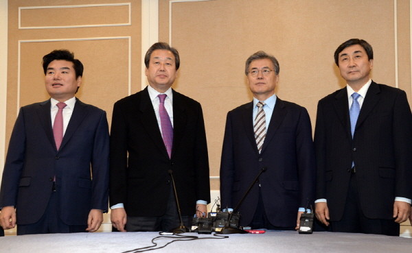 ▲ 여야 지도부는 지난 20일 국회 귀빈식당에서 쟁점법안 및 선거구획정 문제를 논의하기 위해 2+2 회동을 가졌다. 사진 왼쪽부터 새누리당 원유철 원내대표, 김무성 대표, 새정치민주연합 문재인 대표, 이종걸 원내대표.<사진출처=새정치민주연합 홈페이지> |