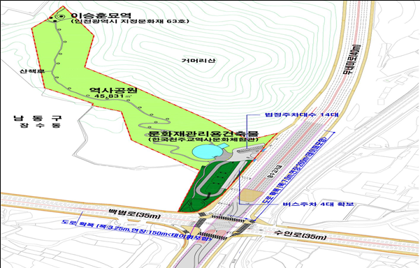 '이승훈 역사공원 조성사업'은 남동구 장수동 산135번지 이승훈 묘역 일대 4만5792㎡의 부지에 ‘역사공원과 천주교 역사문화체험관’을 조성하는 사업이다.