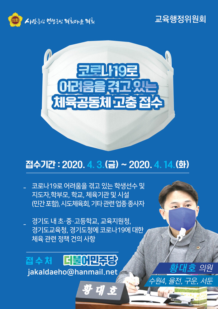 [로컬세계 고기훈 기자]경기도의회 교육행정위원회 황대호 의원(더불어민주당, 수원4)은 코로나19로 인해 어려움을 겪고 있는 경기도 내 학생선수와 지도자, 시군체육회, 민간체육시설 등 체육공동체 및 체육계 종사자들을 대상으로 경기도 체육생태계 회복을 위한 고충 및 정책 제안을 오는 14일까지 공개제보를 통해 접수 받는다고 3일 밝혔다.