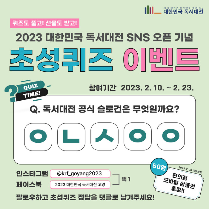 이동환 고양특례시장은 “공식 SNS에서 독서대전의 다양한 콘텐츠를 실시간으로 알릴 예정이다. 책을 좋아하고 독서대전을 기다리는 시민 여러분의 관심과 구독을 부탁드린다”고 전했다.
