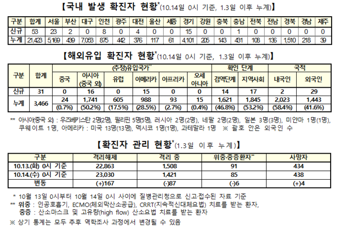 질병관리청 중앙방역대책본부(본부장:정은경 청장)는 14일 0시 현재, 국내발생 신규 확진자는 53명이 확인됐고, 해외유입은 31명이 확인돼 총 누적 확진자수는 2만4889명(해외유입 3466명)이라고 밝혔다.