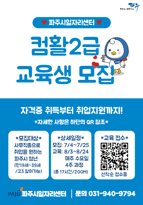 [로컬세계 = 이영원 기자]경기 파주시는 오는 25일까지 청년층을 대상으로 ‘컴퓨터활용능력 2급’ 자격증 참여자 20명을 모집한다고 1일 밝혔다.