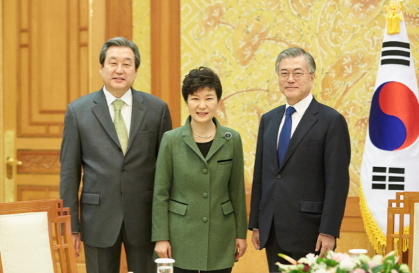 ▲ 박근혜 대통령이 지난 3월17일 오후 청와대에서 열린 여야대표 회동에서 새누리당 김무성 대표, 새정치민주 연합 문재인 대표와 기념촬영하고 있다. |