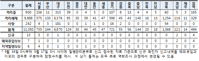 질병관리본부 중앙방역대책본부(본부장 정은경)는 17일 0시 현재, 신규확진자가 13명 발생해 총 누적 확진자수는 1만1050명(해외유입 1167명·내국인 89.2%)이라고 밝혔다.