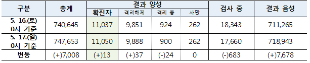 ◆국내 신고 및 검사 현황 (5.17일 0시 기준, 1.3일 이후 누계)