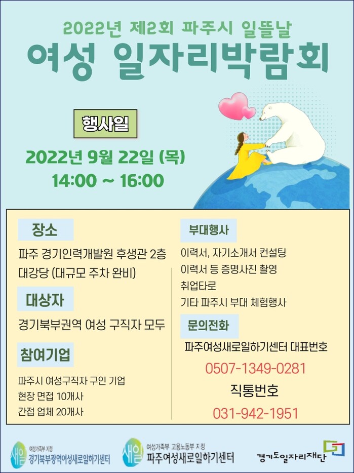 [로컬세계 = 이영원 기자]경기 파주시는 경기도일자리재단에서 파주여성새로일하기센터와 오는 22일 파주 경기인력개발원에서 하반기 여성취업박람회 ‘일뜰날’을 개최한다고 밝혔다.