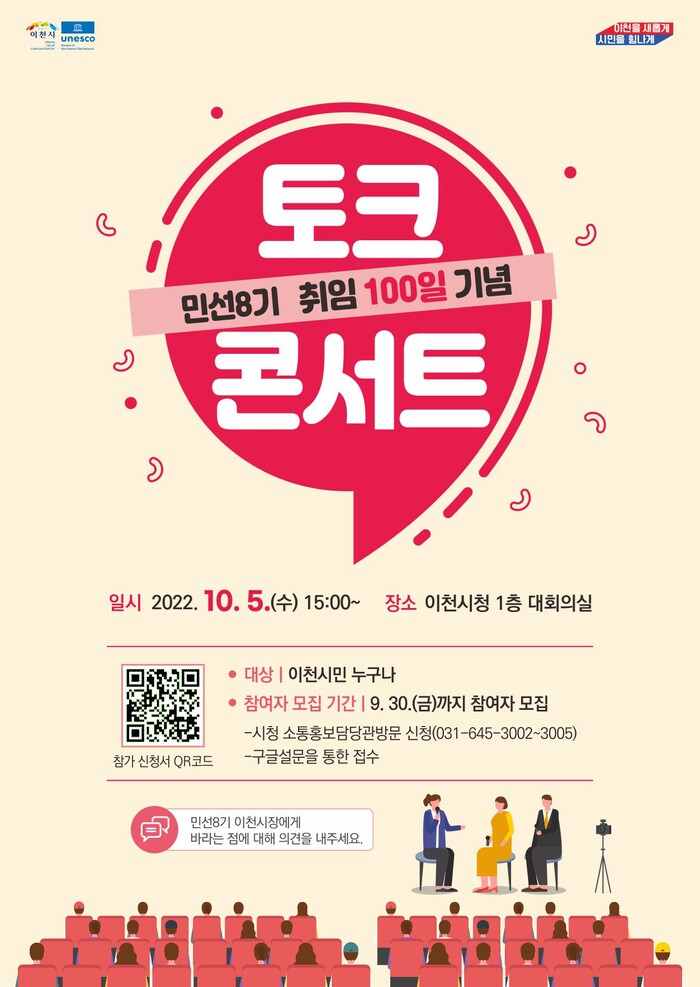 이번 토크콘서트는 이천시민이라면 누구나 참여 가능하다. 이천시청 홈페이지와 시청 소통홍보담당관 시민소통팀으로 방문신청 또는 홍보포스터의 QR코드를 활용한 구글설문 접수 등으로 신청할 수 있다.