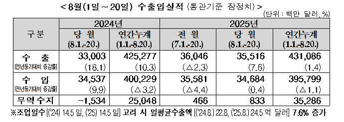 조업일수(2024·2025년 동일 14.5일)를 고려한 일평균 수출액은 24억5천만 달러로 지난해 같은 기간보다 7.6% 늘었다.